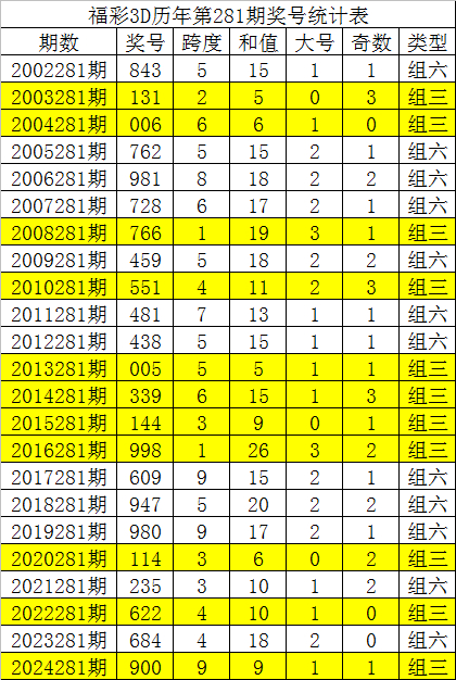 福彩3D历年第281期同期分别开出奖号:843、131、006、762、981、728、766、459、551、481、438、005、339、144、998、609、947、980、114、235、622、684、900,详细统计见下表: