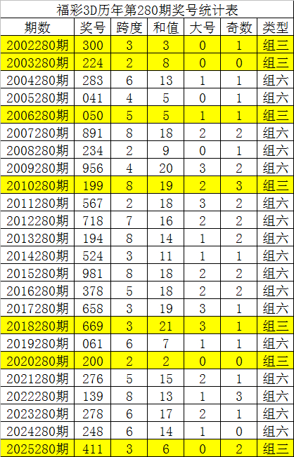 从以上统计可以看出,历年3D第281期开出了11次组三号码,开出了12次组六号码。组六号码表现相对较冷,本期预计开出组六号码。